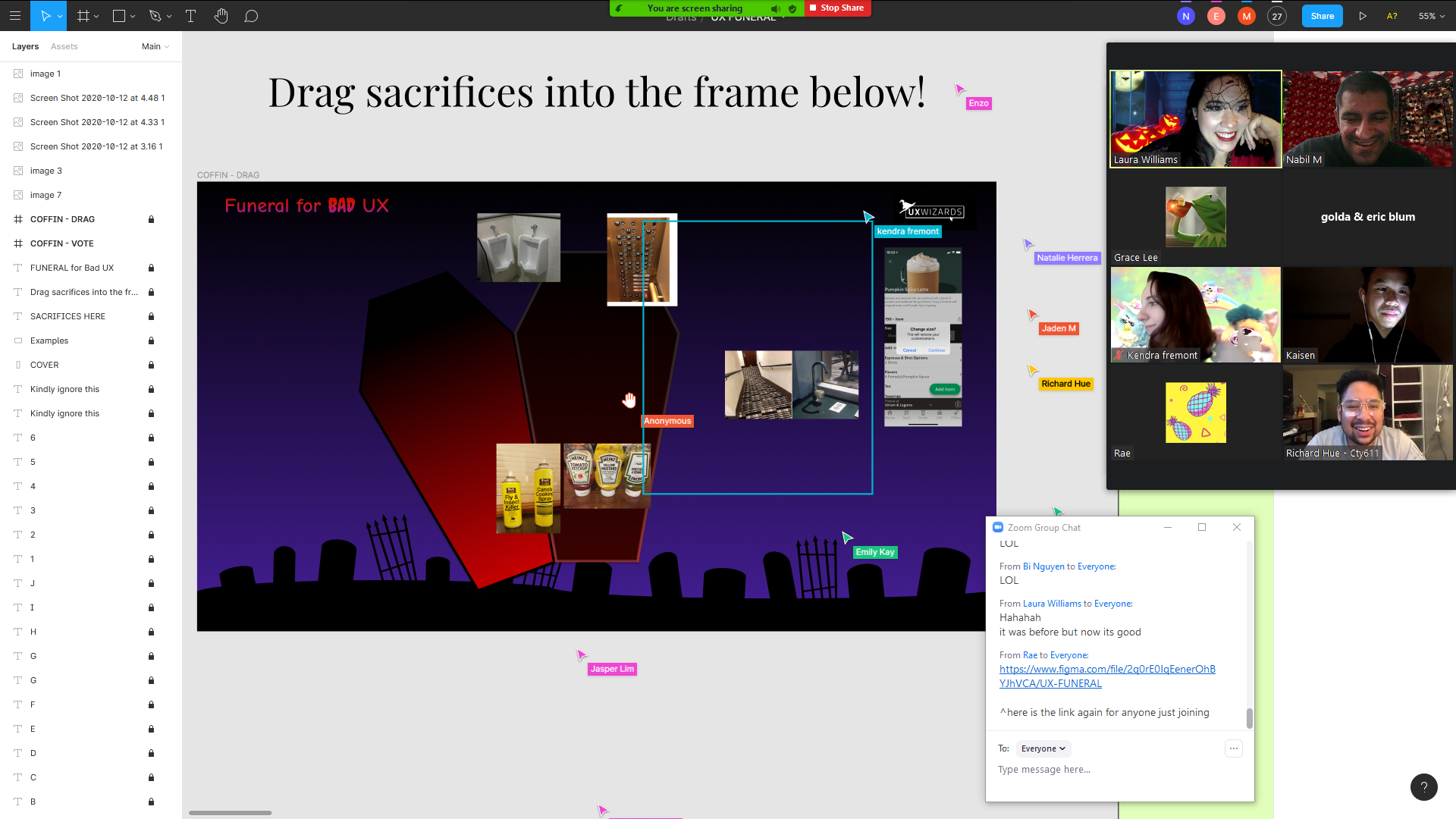 On Tuesday, October 27 2020, I hosted a virtual event through UX Wizards, “Funeral for Bad UX Figma Party.” Participants shared terrible examples of user experiences by placing images into a coffin using the collaborative design tool Figma. Here was the event description:
