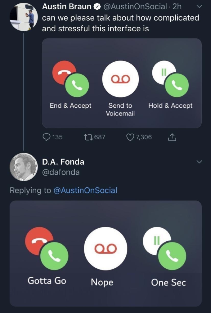 The icons and labels are confusing since they indicate opposite meanings for one button.. How does the user know if they are accepting or declining a call?