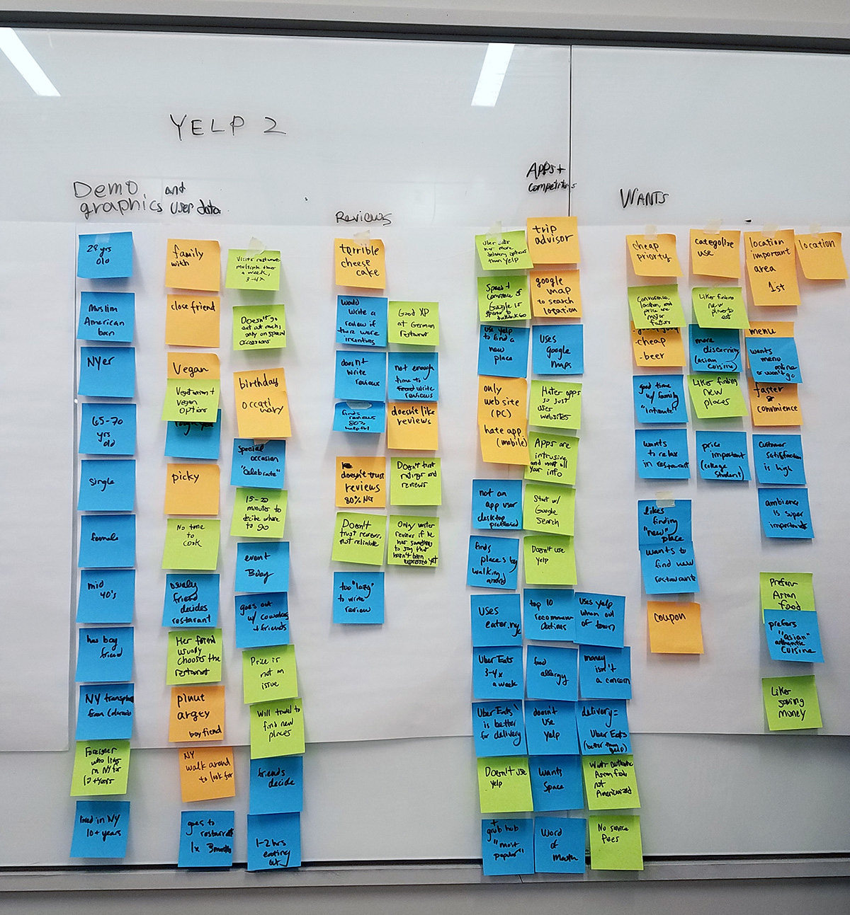 We started mapping out our ideas and results from our interviews and research. Through affinity mapping, we categorized our findings and split them into demographics, user data, reviews, competition, wants, and pain points. We used this data to create personas.