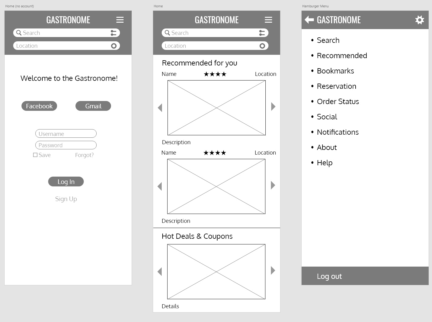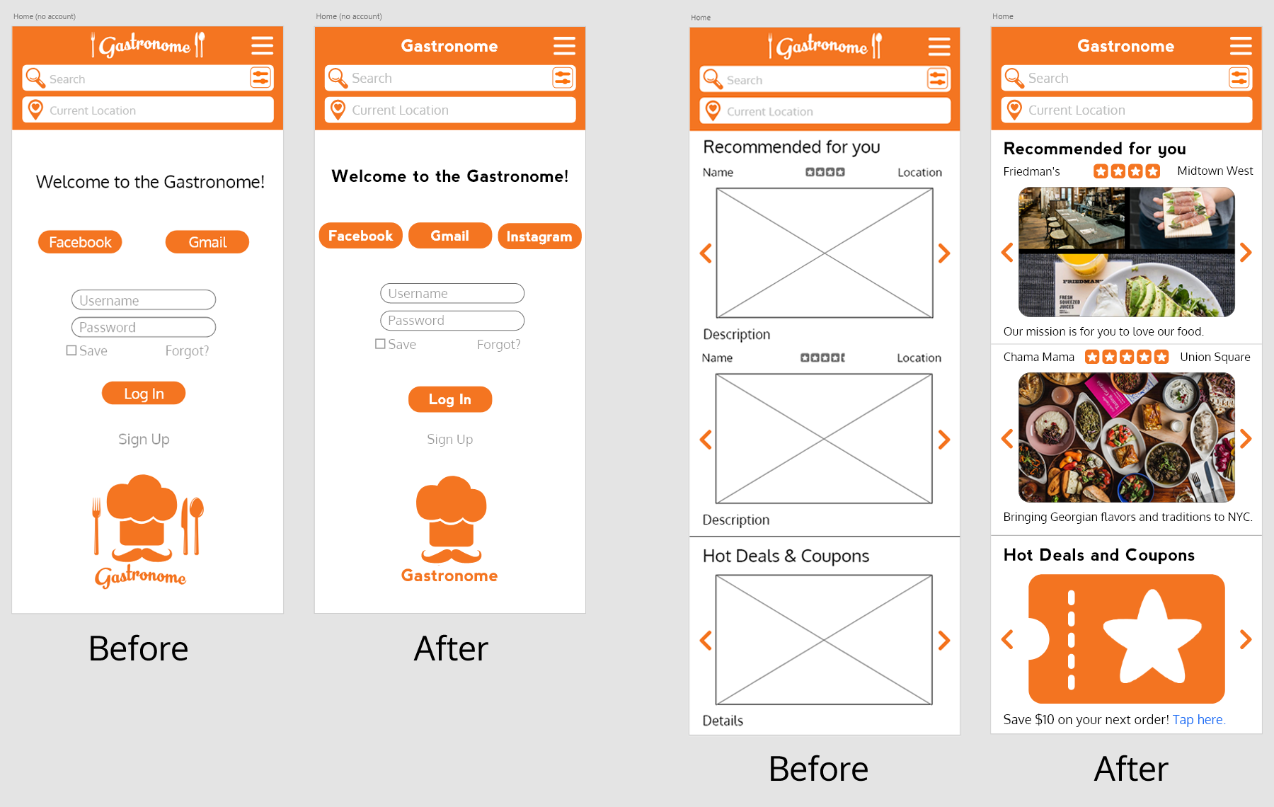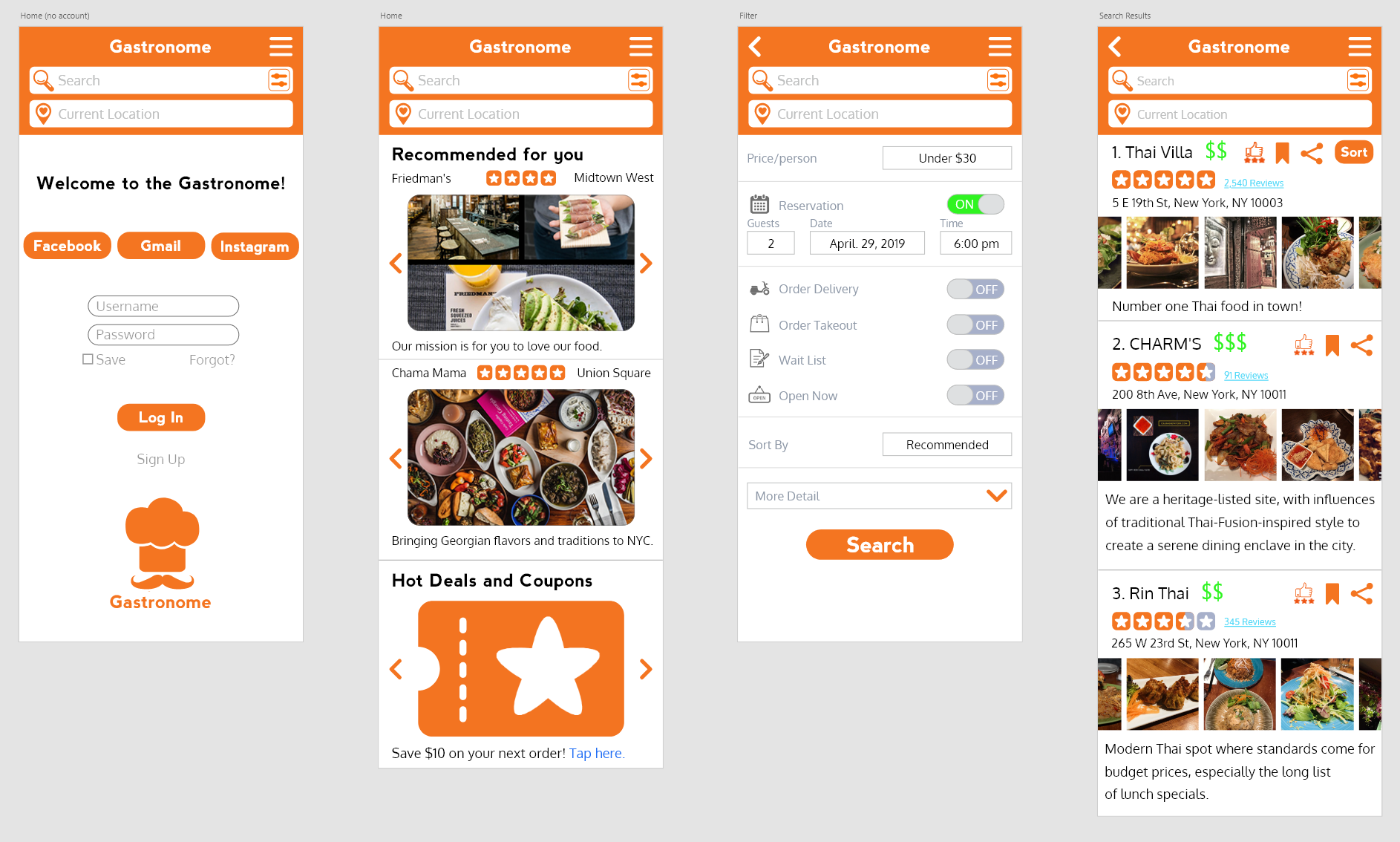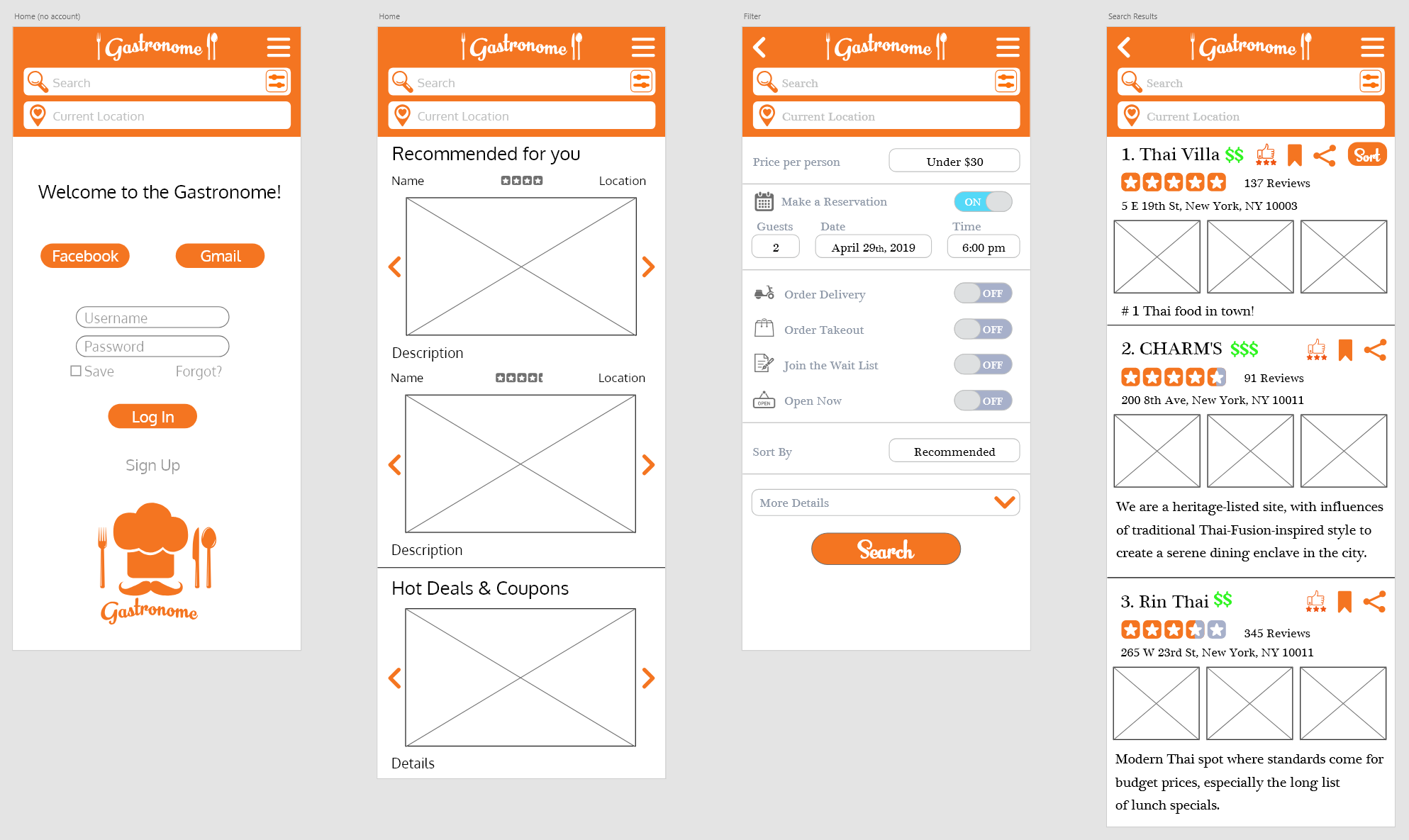 The next wireframe was created in Adobe XD. Users can now login through their Facebook or Gmail accounts. A location bar was added along with search and filter buttons, which lets users filter results before performing a search. After logging in, the user will be shown recommended restaurants based on their profile as well as deals and coupons.