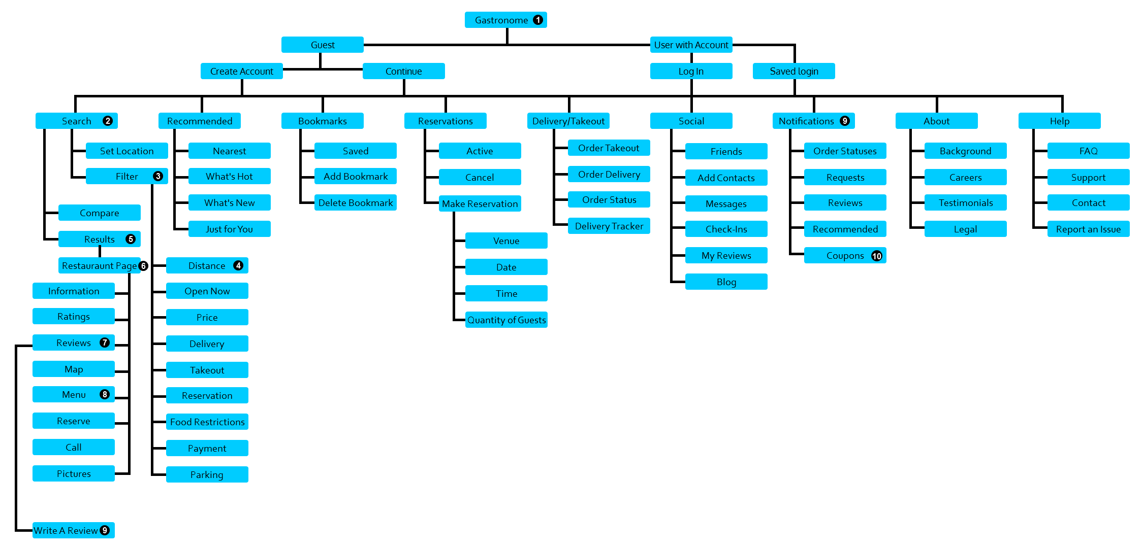 A site map was created to organize the hierarchy and navigation of Gastronome. The numbers on the site map indicate the order of the task flow. The site map was created in Axure RP.