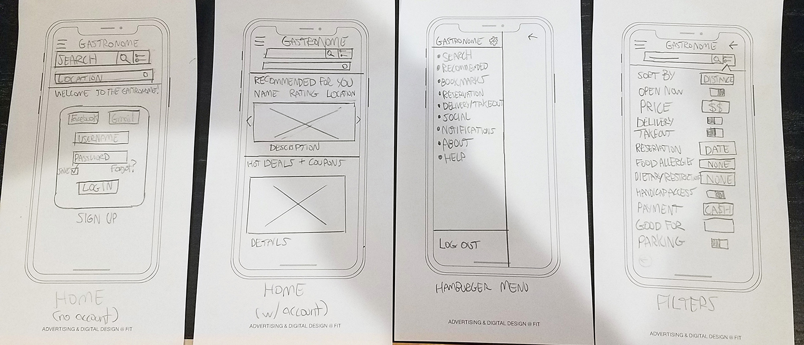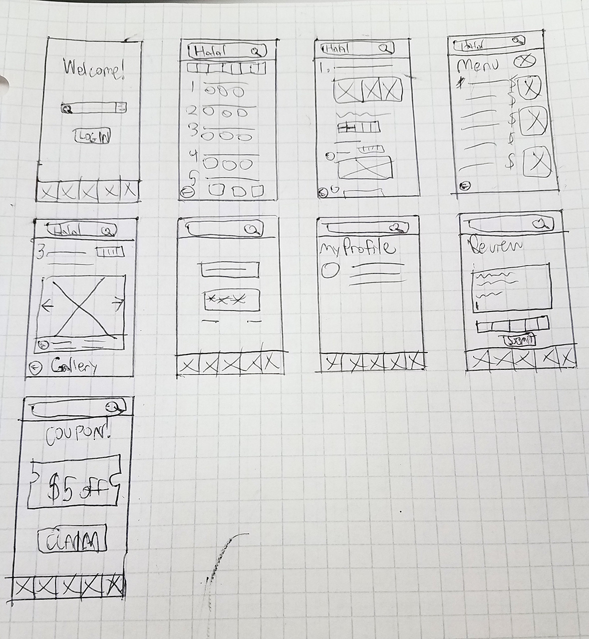 Here is the first paper wireframe, which would be later aggrandized into a mid-fidelity wireframe and a paper prototype.