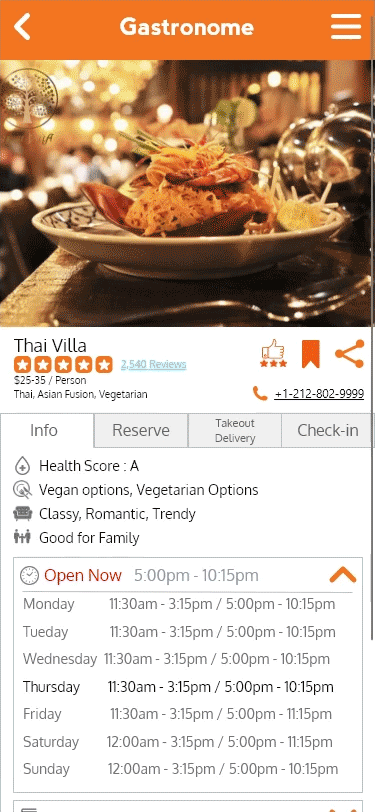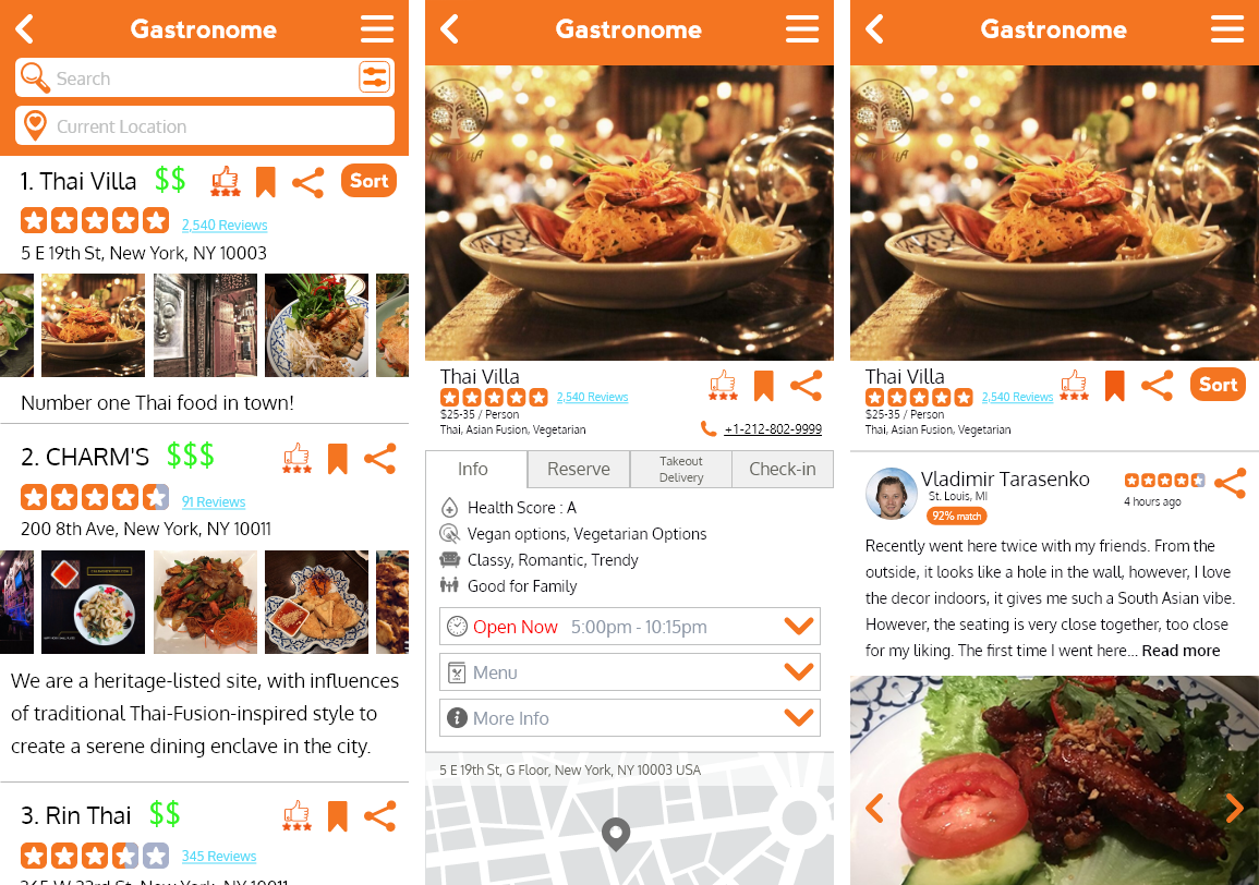 Sample search for Thai food, including restaurant page and reviews.