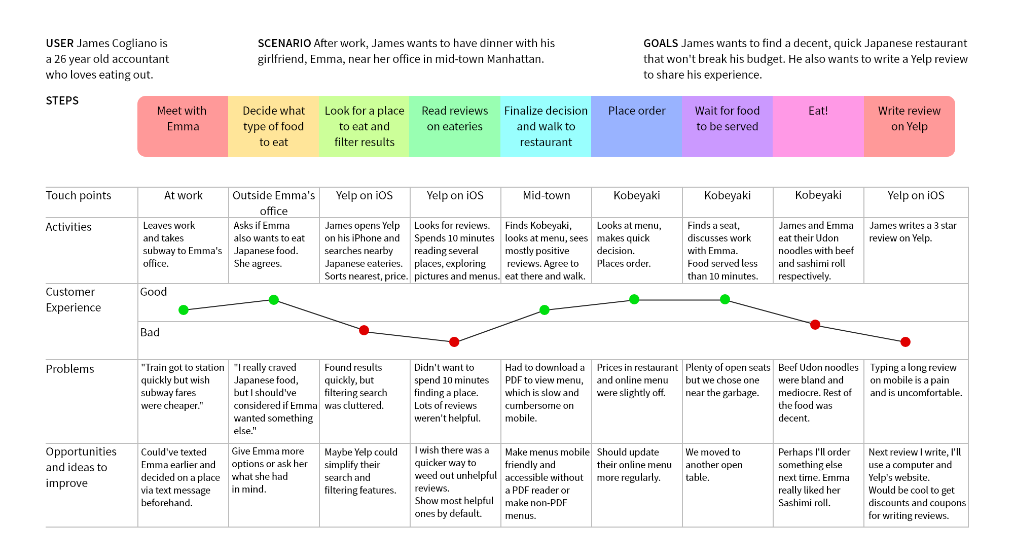 The journey map details a scenario where James goes out for dinner after work with his girlfriend Emma. Several key points were ideated from our maps: