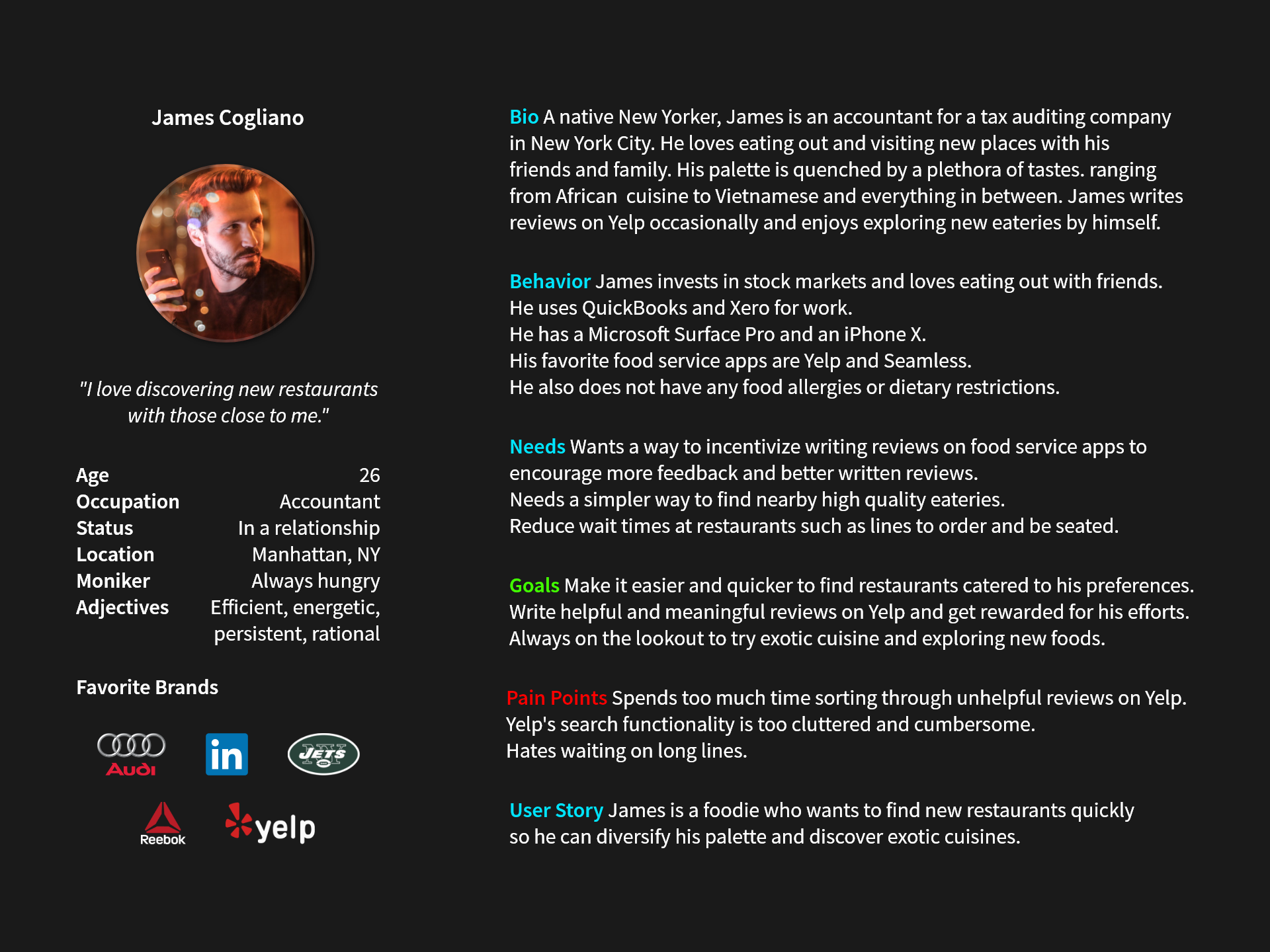 James is a foodie and his goals, needs, and pain points were the result of the previous research compiled. Here are some user stories that were developed based on him: