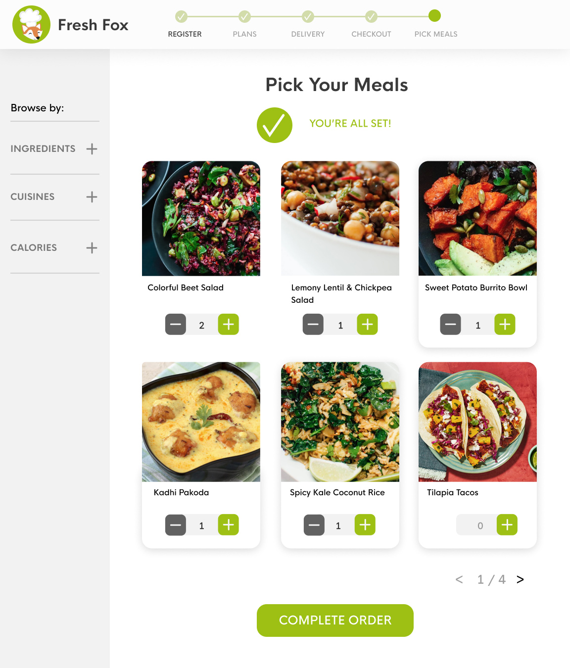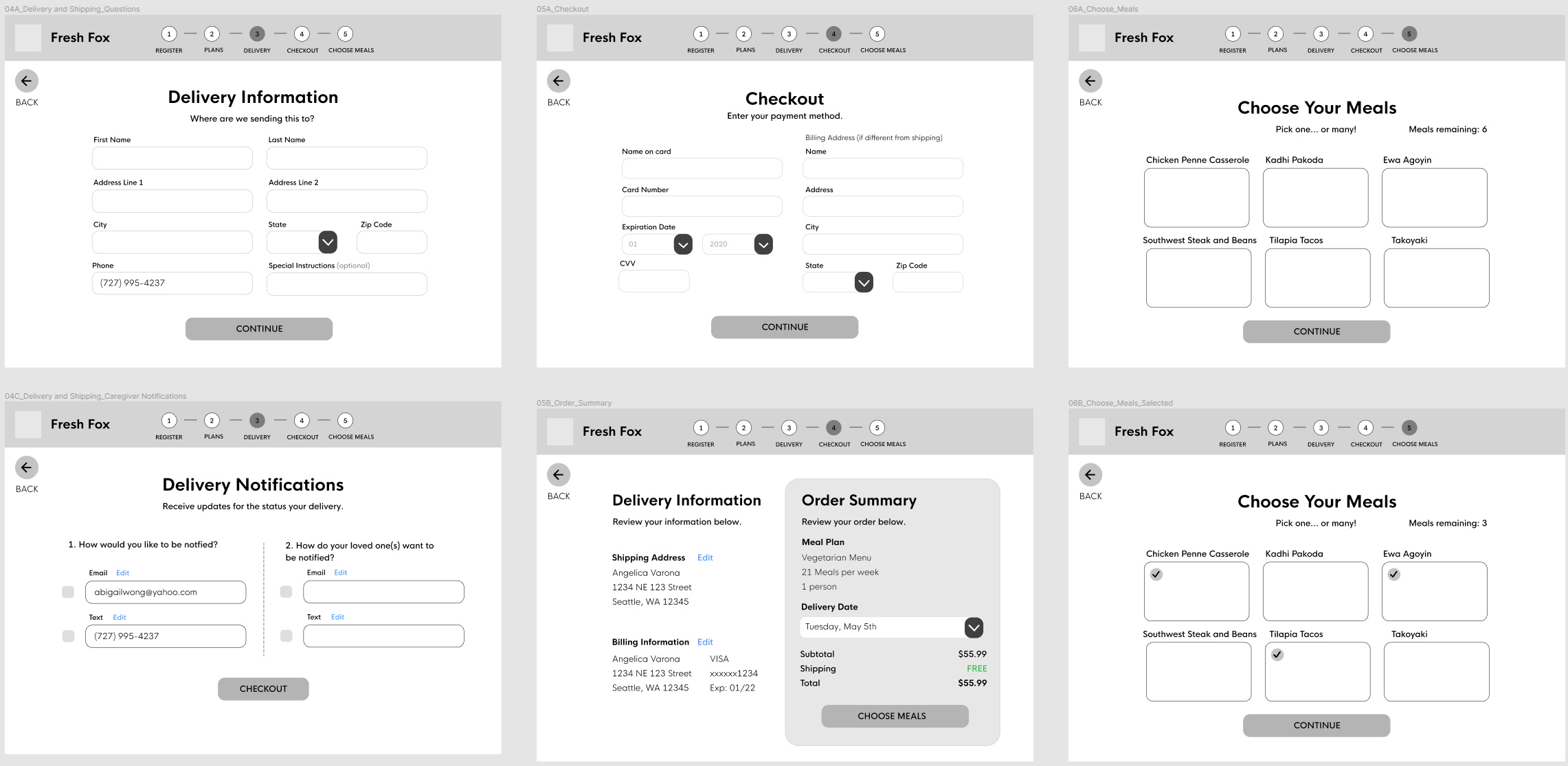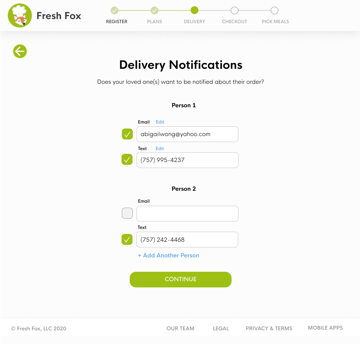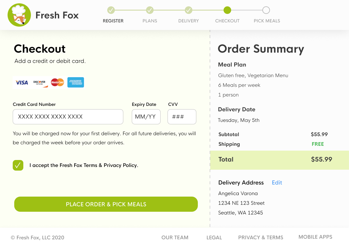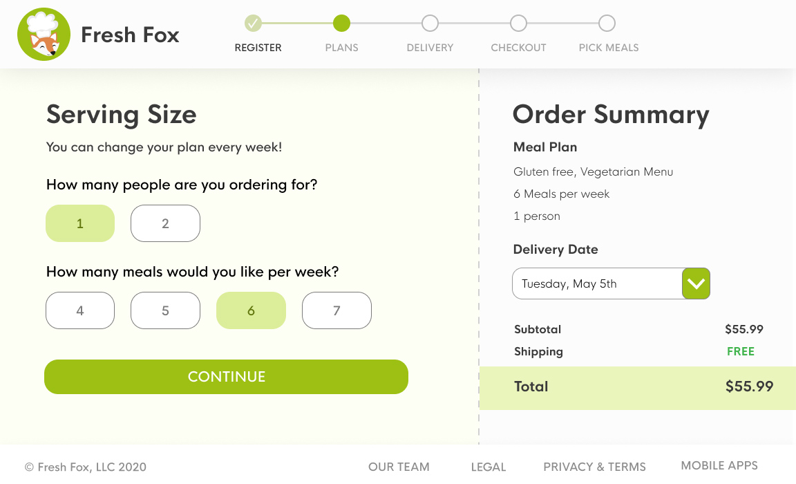 The user specifies number of meals and can change delivery date. Users input delivery information on the next page.