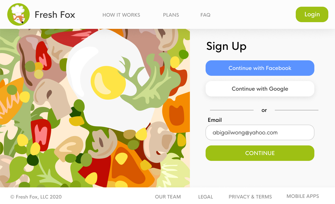 Sign up page with options to join through Facebook or Google.