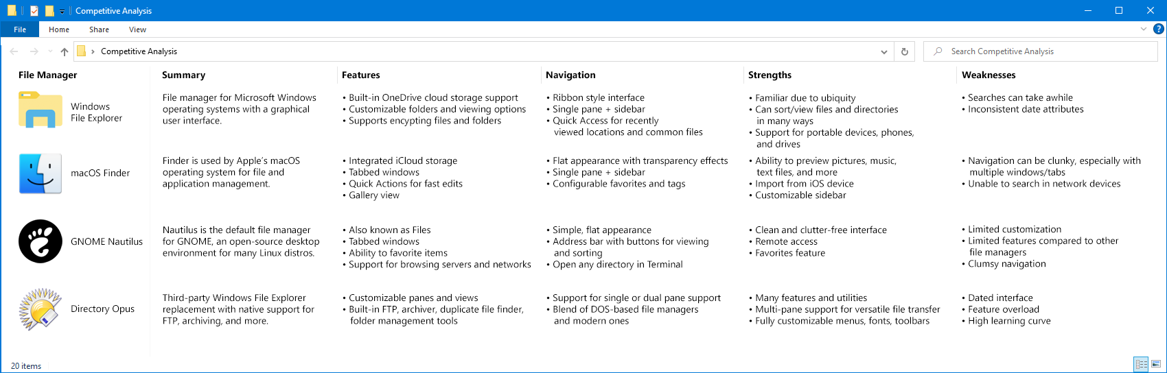 Competitive analysis of Windows File Explorer, macOS Finder, GNOME Nautilus, and Directory Opus.