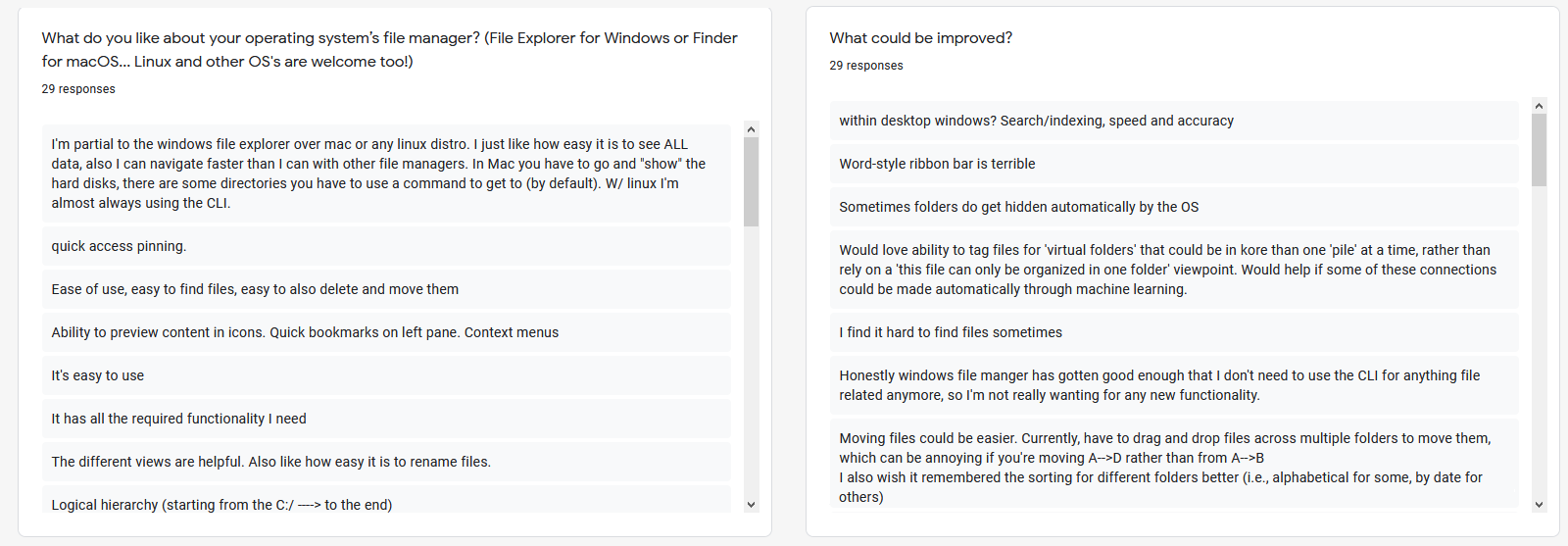 I sent a Google Forms survey asking users about their file manager’s pros and cons, suggested improvements, and how they organize data.